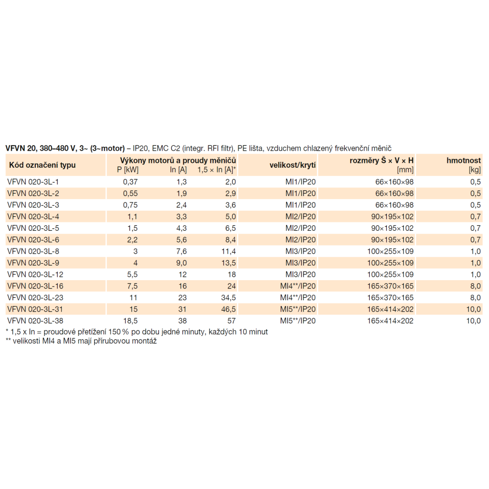 Frekvenční měniče VFVN 20 jsou přizpůsobeny pro snadné použití v běžných aplikacích. VFVN 20 se dodává ve všech běžných napětích (110–575 V) a s širokým rozsahem výkonů (do 18,5 kW). Rychlé a pohodlné uvádění do provozu se snoubí s výjimečnou flexibilitou a širokým sortimentem dodávaného příslušenství, což umožní uspokojit i ty nejnáročnější požadavky zákazníků.