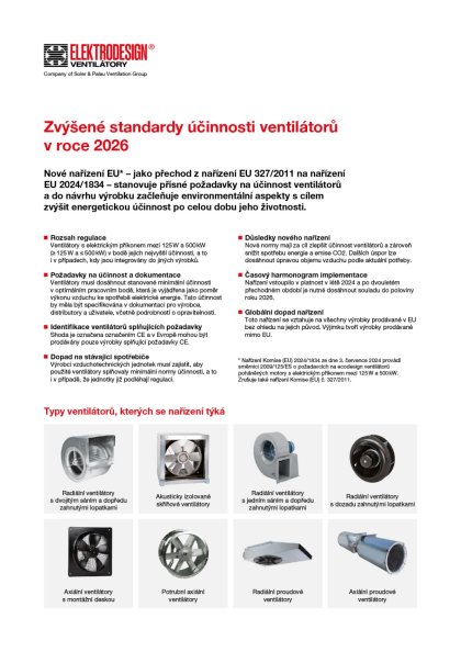 jako přechod z nařízení EU 327/2011 na nařízení EU 2024/1834 – stanovuje přísné požadavky na účinnost ventilátorů a do návrhu výrobku začleňuje environmentální aspekty s cílem zvýšit energetickou účinnost po celou dobu jeho životnosti.