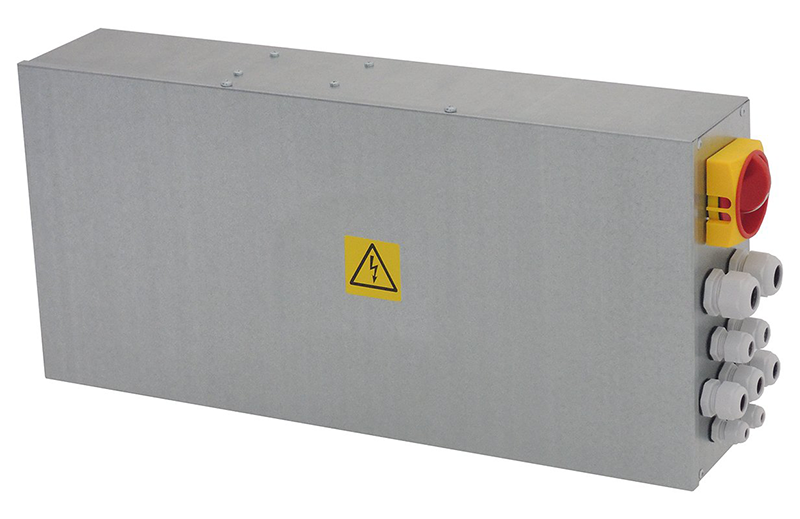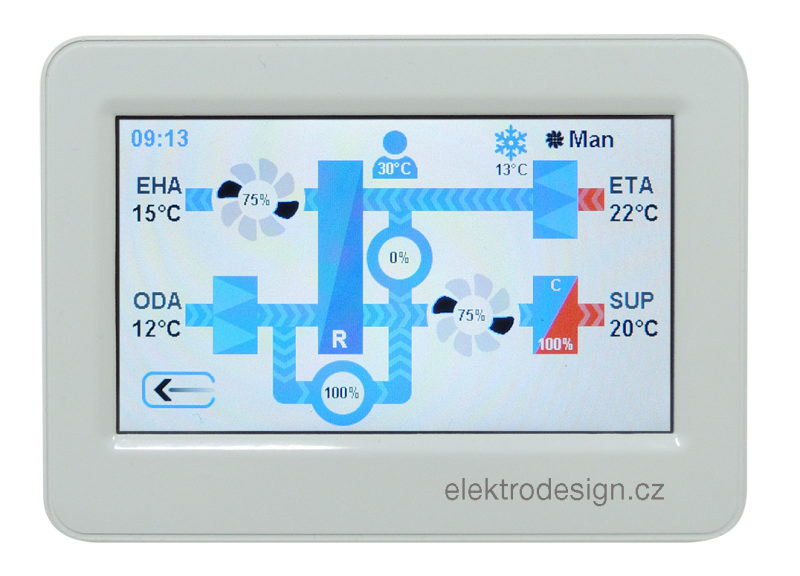 Řídicí i silová část jsou integrovány v jednom rozvaděči včetně výstupů pro přívodní i odvodní ventilátor.