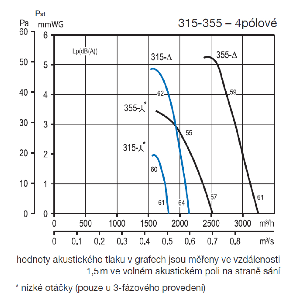 emitted by the fan is given in the tables as sound pressure values at a distance of 1.5 m, measured in the free sound field.