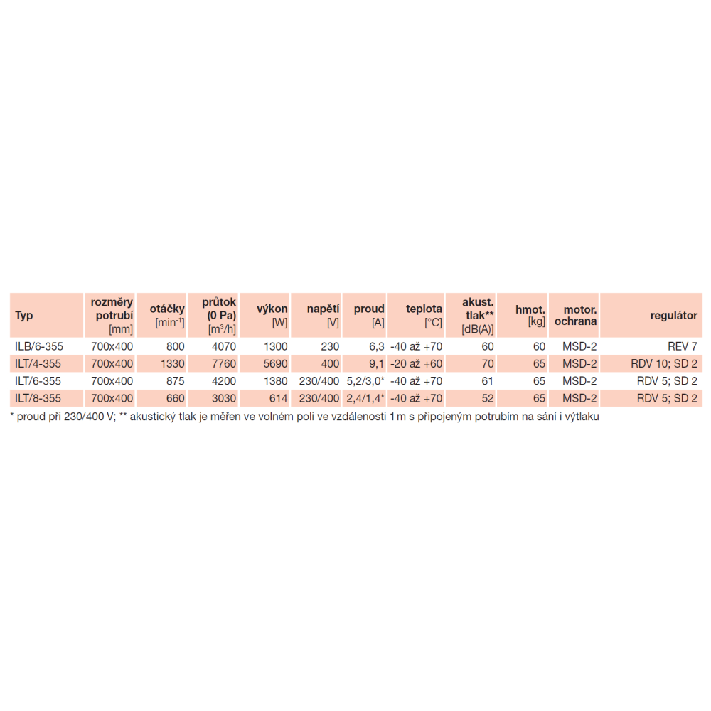 is asynchronous with a resistive armature. ILB fan motors are 1-phase for 230 V, ILT are 3-phase for 230/400 V or 400 V. The motors are equipped with thermal fuse as standard, class F insulation, working temperature according to type. Sealed ball bearings have grease packing for life. IP55 protection.