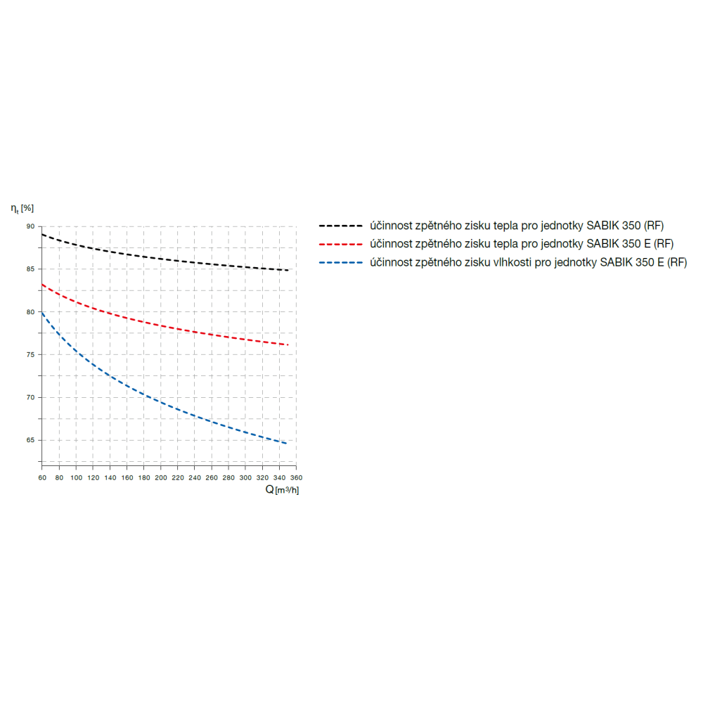 The unit is equipped with a fully automatic control system, which, in combination with four temperature and relative humidity sensors, ensures continuous speed regulation according to the actual requirement, without the need for any further intervention in the unit control. In the performance characteristics, curves for individual speeds are indicated (see operating instructions for details). The designer wired controller allows manual fan speed switching, by-pass control, activation of the intensive ventilation function (boost), activation of automatic operation, night cooling and filter clogging indication. In the RF version, the unit is equipped with a radio frequency remote control that allows manual switching of fan speed and activation of automatic operation. Further unit settings are made via DIP switches and potentiometers on the unit's control electronics (after removing the front cover). The unit has four pre-set weekly programs, one of which allows automatic operation from a humidity sensor, built-in VOC sensor (optional accessory), or a 0-10V analogue override signal. SABIK units can be supplemented with a built-in module providing constant airflow control SABIK-NEMBUS-SF. The external SPCM Lite M module enables remote management via a mobile app or the Connectair web interface.