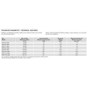 2, 4 nebo 6pólové, IE 3 s vysokou účinností (od 0,75 kW může být motor IE 2 a řízen frekvenčním měničem), třífázové provedení 230/400 V, 50 Hz do velikosti motoru 132. Pro velikosti motoru nad 132 400/690 V, 50 Hz. Krytí IP55, izolace třídy F.