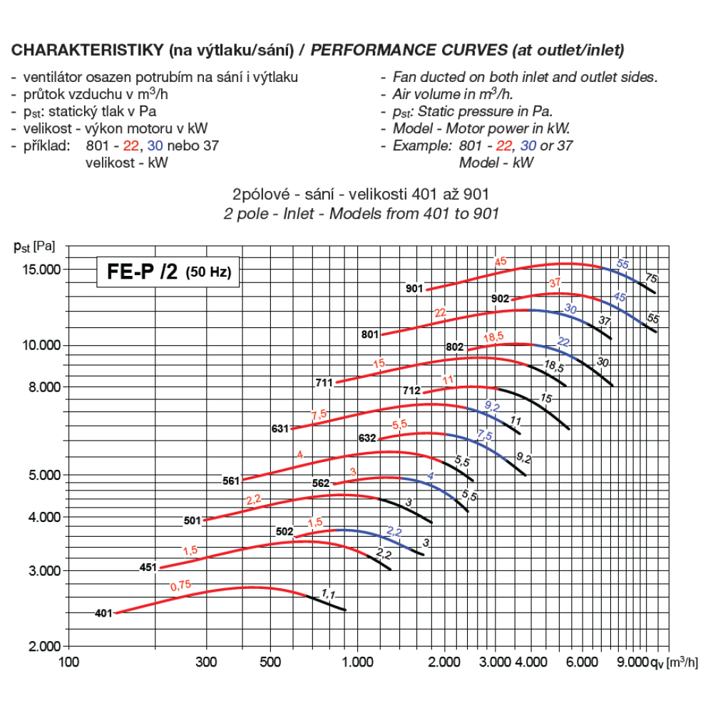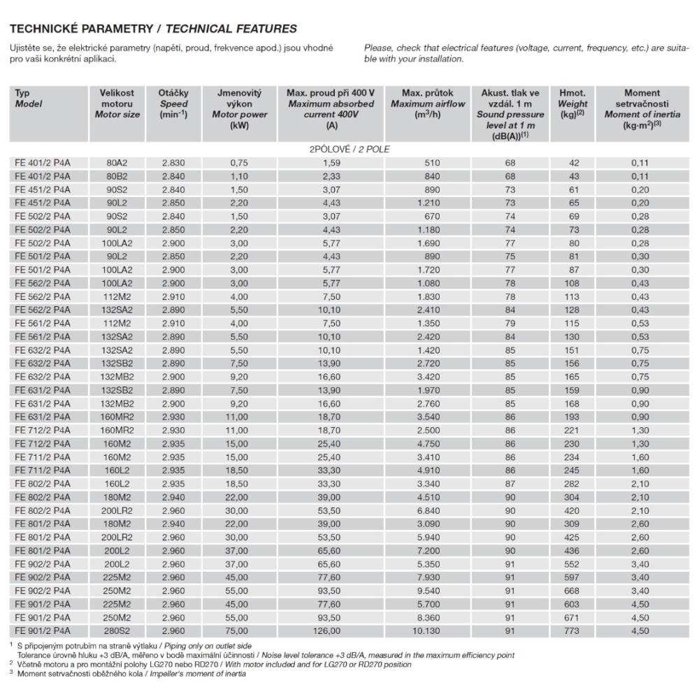 2pólové, IE 3 s vysokou účinností (od 0,75 kW může být motor IE 2 a řízen frekvenčním měničem), třífázové provedení 230/400 V, 50 Hz do velikosti motoru 132. Pro velikosti motoru nad 132 400/690 V, 50 Hz. Krytí IP55, izolace třídy F.