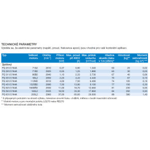 2, 4 nebo 6pólové, IE 3 s vysokou účinností, třífázové provedení, 230/400 V, 50 Hz do velikosti motoru 132, 400/690 V, 50 Hz pro velikosti motoru nad 132. Krytí IP55, izolace třídy F. Všechny motory lze regulovat FM