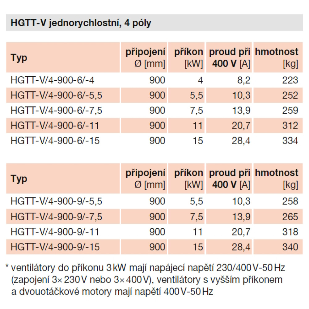 Ventilátory pro kruhové potrubí o průměrech 900 mm. Podstavec i skříň ventilátoru jsou vyrobeny z ocelového plechu opatřeného antikorozní ochranou. Ventilátory jsou vybavené třífázovým 230/400 nebo 400 V / 50 Hz motorem, mají krytí IP55 a jsou vhodné pro provoz s teplotou vzduchu až 40 °C. Ventilátor je chráněn mřížkou proti vniknutí cizích těles, na výtlaku je zpětná klapka.