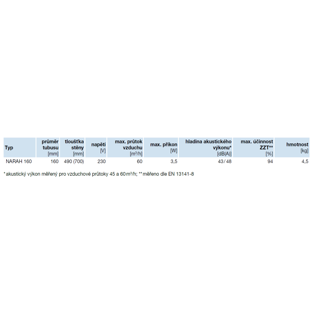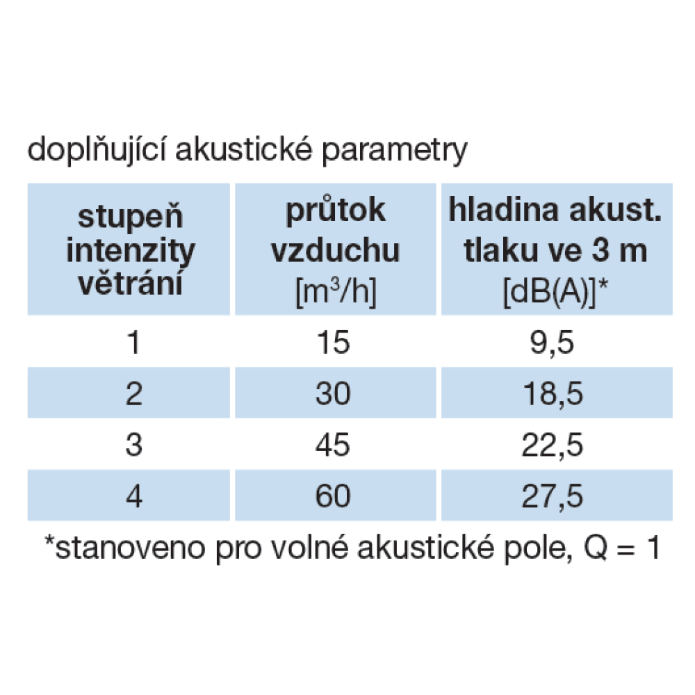 V tabulkách je uvedena hladina akustického výkonu měřená při průtoku 45 a 60 m3/h.