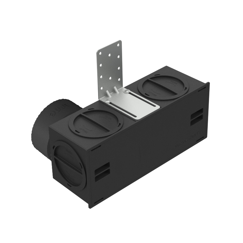 Univerzální kruhový distribuční systém pro rozvod vzduchu rezidenčního větrání s plastovými hrdly o Ø 75/90 mm, včetně integrované regulační klapky s aretací.