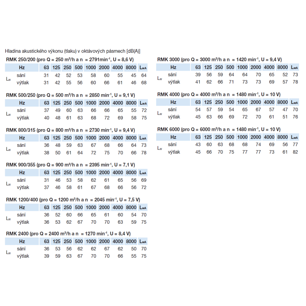 uvedený v tabulkách představuje hladiny akustického výkonu na sání a výtlaku jednotky s korekcí váhového filtru A.