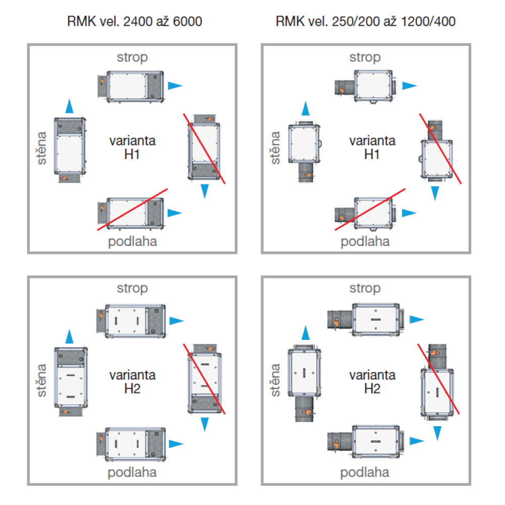 je možná v horizontální poloze s obslužnou stranou z boční strany jednotky (označení v kódu jednotky H2) nebo ze spodní strany jednotky (označení v kódu jednotky H1). Dále je možné rozlišit pravé (P) a levé provedení (L) dle pozice vývodů vodního ohřívače nebo pozice připojovací svorkovnice elektrického ohřívače (pro vel. 2400, 3000, 4000, 6000). Pozice L nebo P se určuje při pohledu na čelní vstupní plochu ohřívače ve směru proudění vzduchu. Vedle jednotky je třeba mít manipulační prostor pro sejmutí víka a vyjmutí filtrů a pro provádění periodických revizí elektroinstalace.