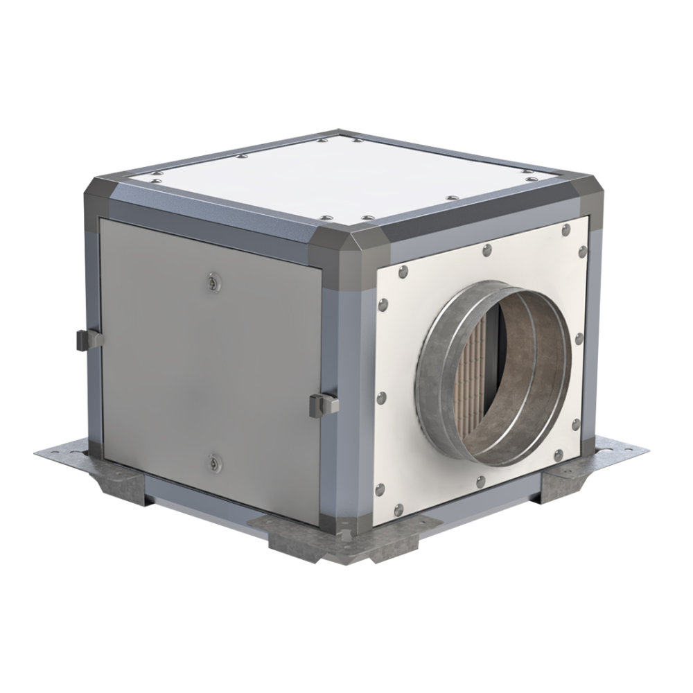 Stěnové panely tloušťky 45 mm jsou vyrobeny z ocelového pozinkovaného plechu s vnějším lakováním v odstínu RAL 9002. Panely jsou uvnitř vyplněné zvukovou a tepelnou izolací z nehořlavé skelné minerální vlny. Pro usnadnění servisu je skříň jednotky vybavena snímatelnými dveřmi se zámky. Rám jednotky je vyroben z hliníkových profilů, stěnové panely jsou do rámu přišroubovány. Připojovací hrdla vodních ohřívačů jsou vyvedena na vnější plášť jednotky. Skříň je opatřena 4 kusy závěsů s otvory Ø 12 mm pro podstropní montáž jednotky.