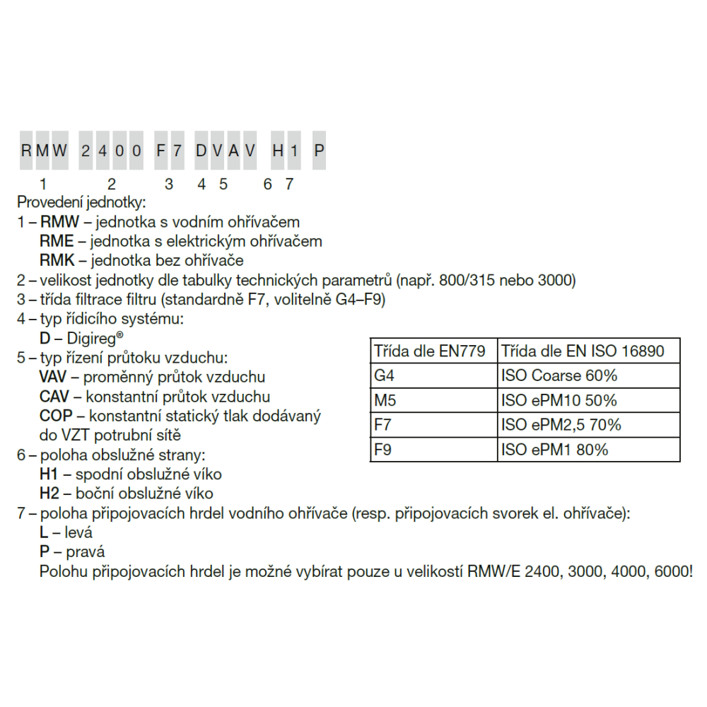 je možná v horizontální poloze s obslužnou stranou z boční strany jednotky (označení v kódu jednotky H2) nebo ze spodní strany jednotky (označení v kódu jednotky H1). Dále je možné rozlišit pravé (P) a levé provedení (L) dle pozice vývodů vodního ohřívače nebo pozice připojovací svorkovnice elektrického ohřívače (pro vel. 2400, 3000, 4000, 6000). Pozice L nebo P se určuje při pohledu na čelní vstupní plochu ohřívače ve směru proudění vzduchu. Vedle jednotky je třeba mít manipulační prostor pro sejmutí víka a vyjmutí filtrů a pro provádění periodických revizí elektroinstalace.