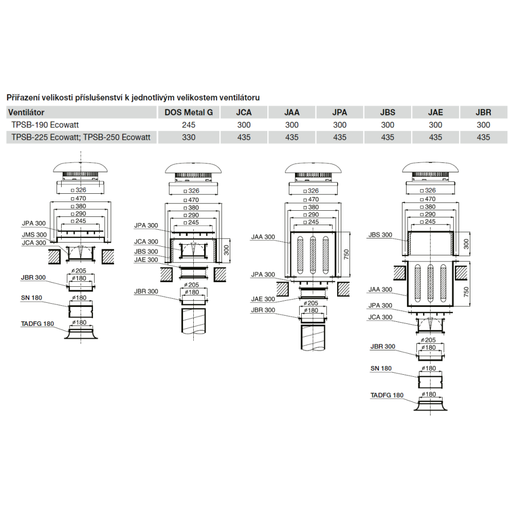 Střešní ventilátory TPSB Ecowatt se montují montážní základnou na vodorovné střešní konstrukce nebo stavebně připravené zděné sokly. Dále je možno použít sokly JMS a JBS.