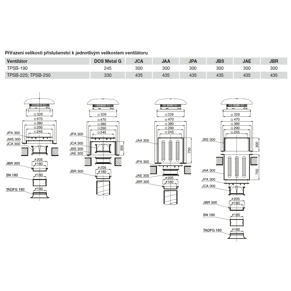 Střešní ventilátory TPSB se montují montážní základnou na vodorovné střešní konstrukce nebo stavebně připravené zděné sokly. Dále je možno použít sokly JMS
