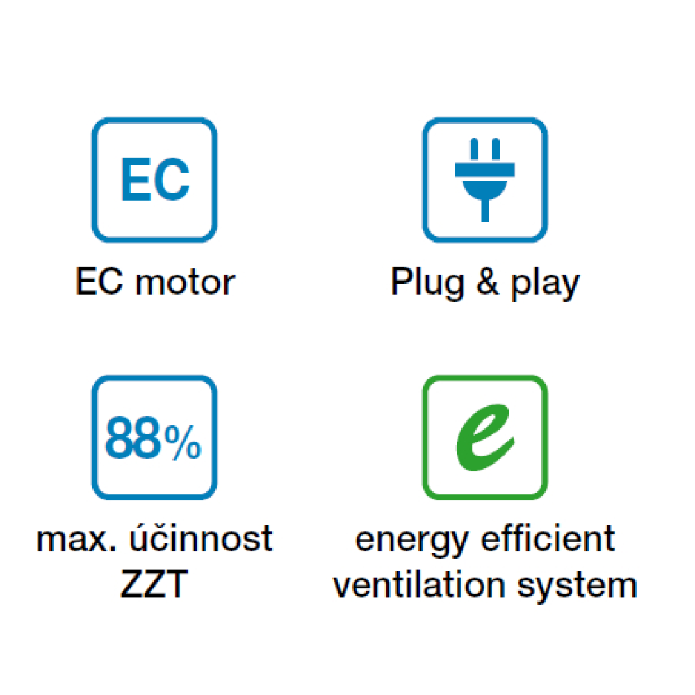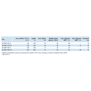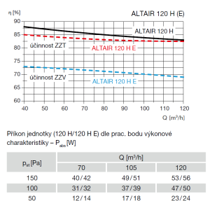 Der Gegenstrom-Plattenwärmetauscher erreicht einen ZZT-Wirkungsgrad von 88% (ALTAIR 120 H) bzw. 87% (ALTAIR 160 H), die Version 120 H E mit Enthalpie-Wärmetauscher erreicht einen ZZT-Wirkungsgrad von 85% und einen ZZV-Wirkungsgrad von bis zu 73%, die Version 160 H E einen ZZT-Wirkungsgrad von 84% und einen ZZV-Wirkungsgrad von 66%.