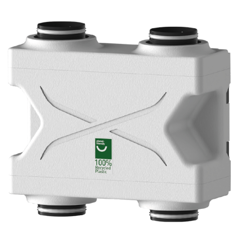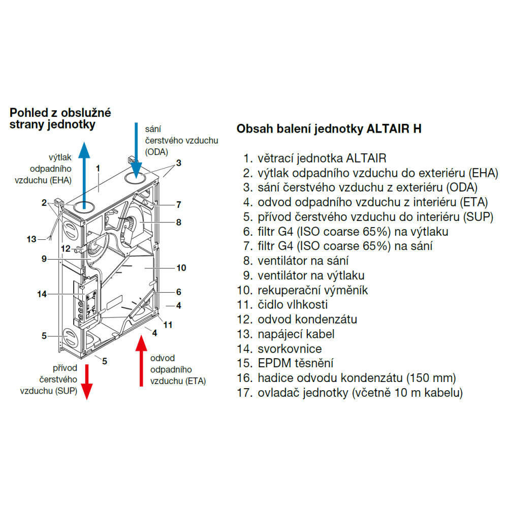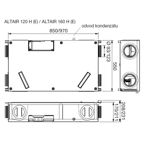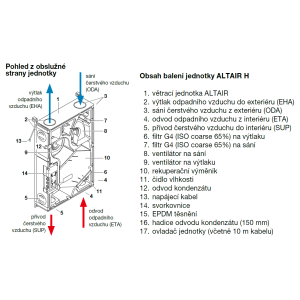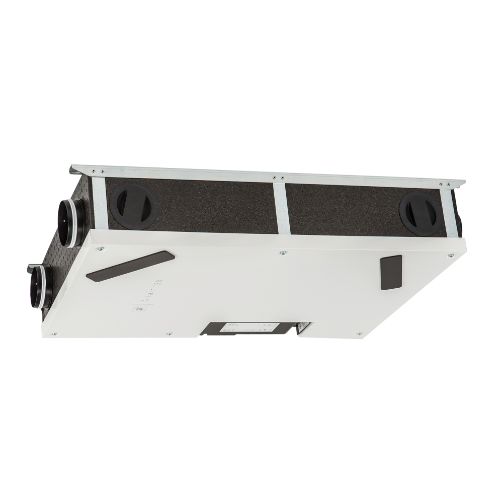 ist aus strapazierfähigem EPP mit hoher Dichte hergestellt. Die vordere Metallplatte ist weiß pulverbeschichtet. Die runden Anschlussstutzen mit doppeltem Dichtungsrand haben einen Ø von 93 mm für ALTAIR 120 H (E) bzw. Ø 123 mm für ALTAIR 160 H (E) und können seitlich gedreht werden. Der Revisionszugang erfolgt von der Vorderseite des Geräts.