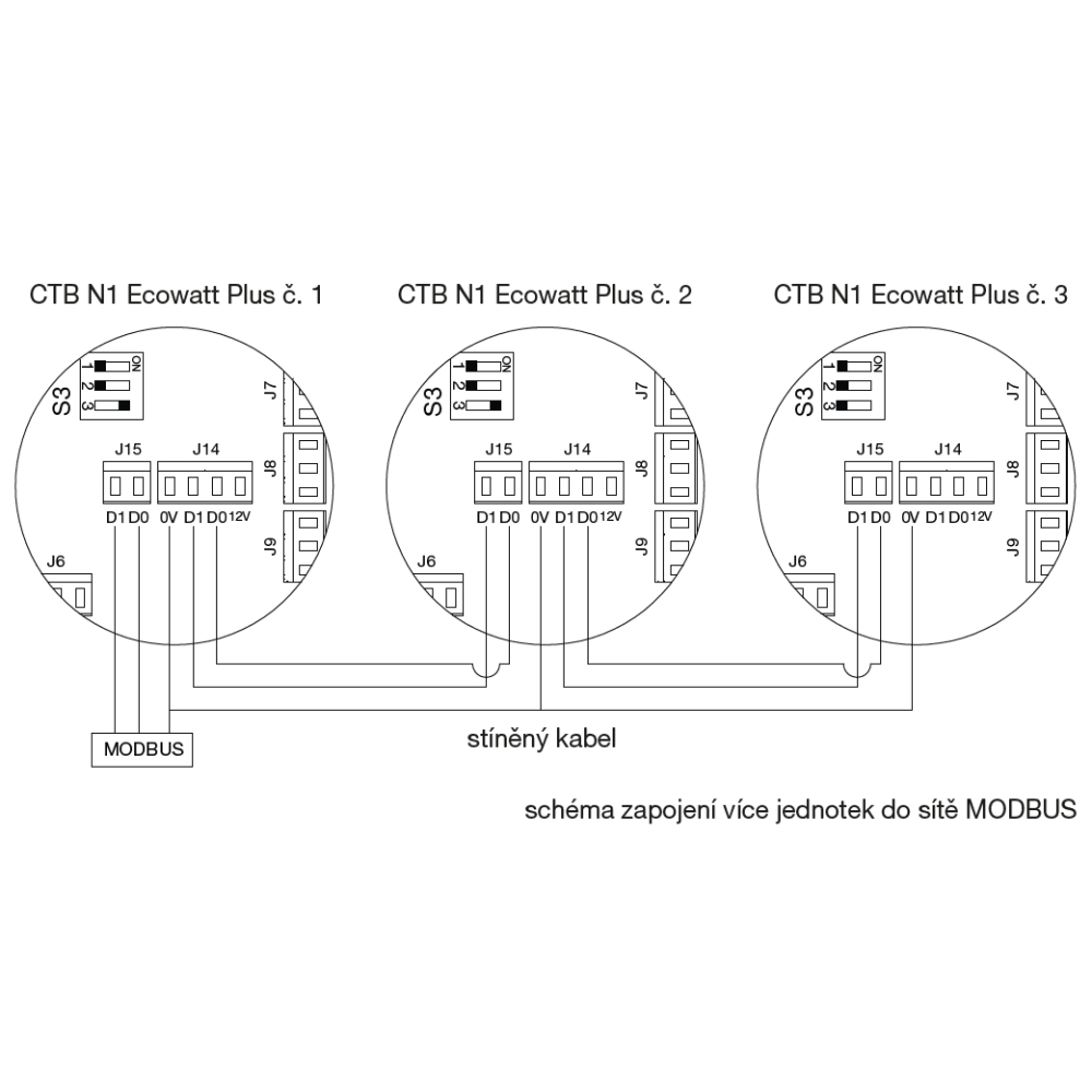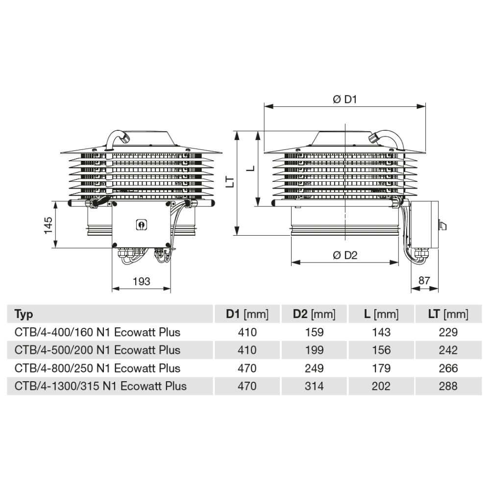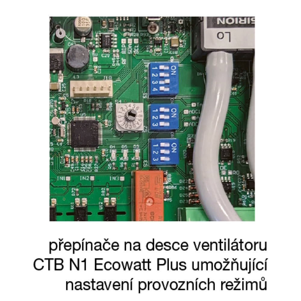 Der Ventilator kann in 4 Grundmodi betrieben werden, die über die Schalter auf der Platine der Steuereinheit umschaltbar sind. Der erste Modus hält einen konstanten Kanaldruck auf der Grundlage eines integrierten Sensors aufrecht. Die anderen Betriebsarten ermöglichen eine stufenlose Regelung auf konstanten Luftstrom (außer Typ CTB/4-400/160 Ecowatt Plus), Proportionalbetrieb oder Lüftungsbetrieb mit 2 umschaltbaren Min/Max-Betriebskennlinien. Die Steuerung ermöglicht den Anschluss von Signalen externer Geräte (CO2-, Temperatur- und relative Luftfeuchtigkeitssensoren) oder eines externen Drucksensors mit Messumformer und 0-10 V oder 4-20 mA Ausgang. Die Steuerung ermöglicht die Ansteuerung über Modbus-RTU. Mit dem Modul SPCM-WS Ecowatt Plus können Sie Ihr Telefon mit WiFi verbinden und den Ventilator einfach über die Web-App einrichten. Das Modul ist nicht im Lieferumfang enthalten.