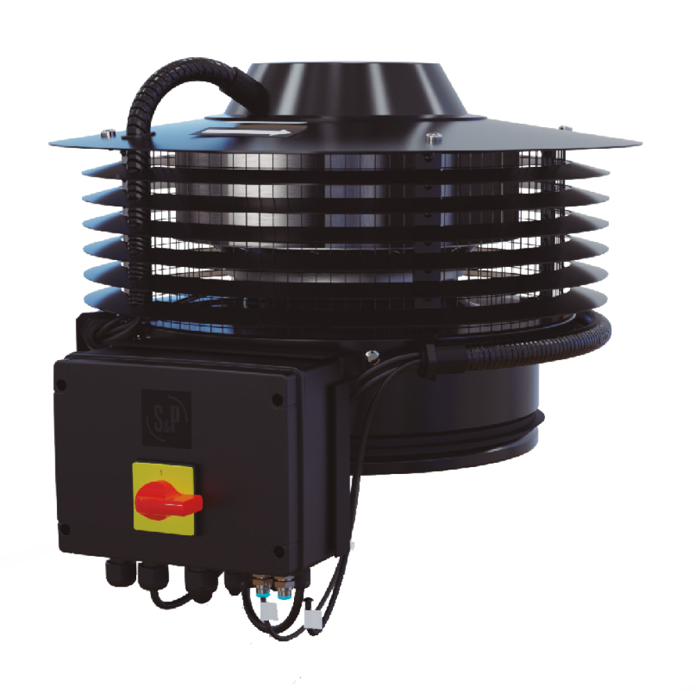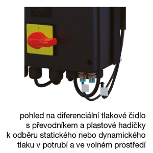 Der Revisionsschalter befindet sich am Ventilatorgehäuse. Die Klemmleiste beherbergt die Steuerplatine mit DIP-Schaltern und Potentiometer zur Einstellung, USB-Anschluss zur Aktualisierung der Software und zum Auslesen der Betriebsdaten sowie Anschlüsse zum Anschluss externer Eingänge. Die Schutzart ist IP55.