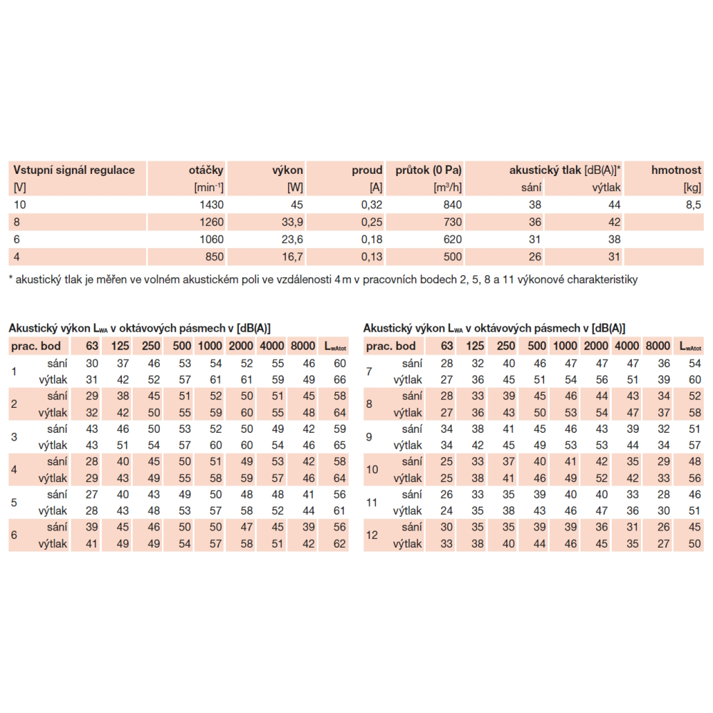 Die Geräuschemissionen des Ventilators sind in den Tabellen aufgeführt.