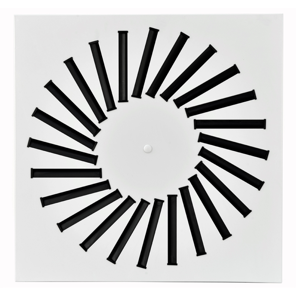 Die Anemostate sind aus verzinktem Blech mit weißer Einbrennlackierung (RAL 9010). Die Lamellen sind aus Kunststoff und schwarz lackiert (RAL 9005).