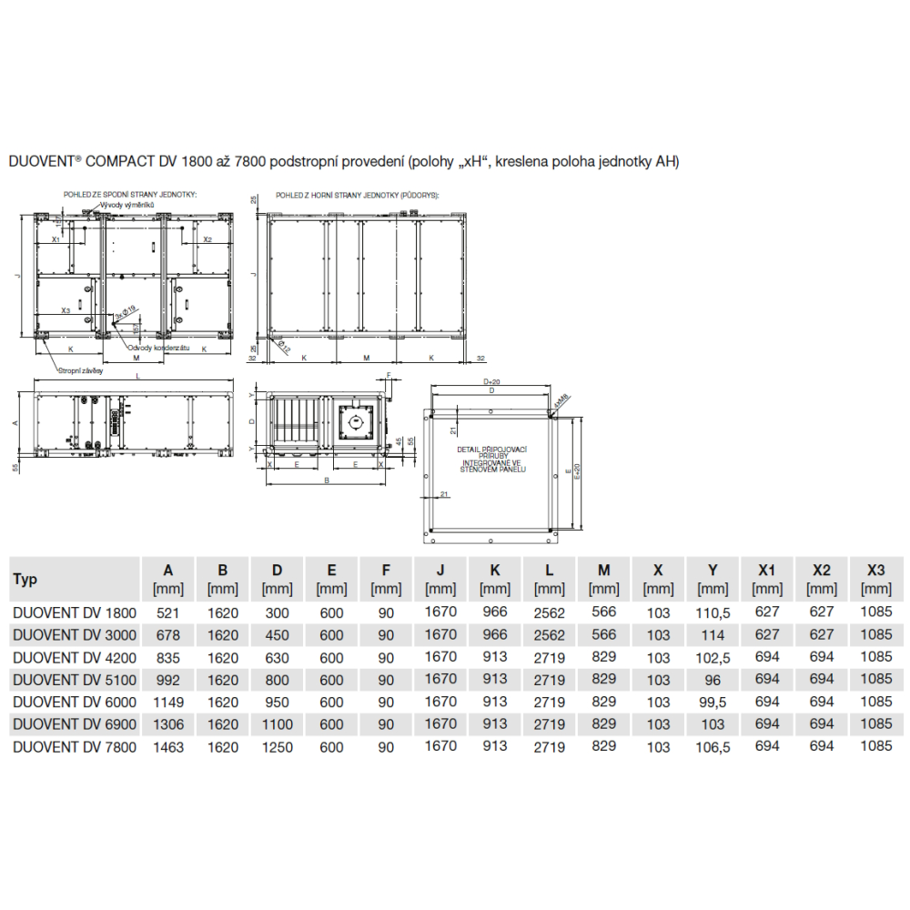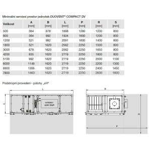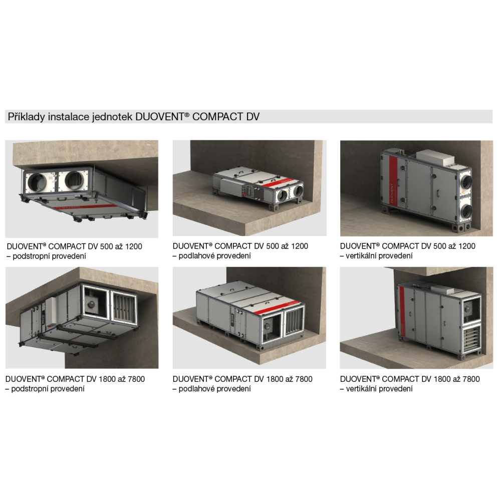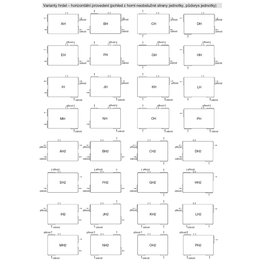 In senkrechter (gekennzeichnete Positionen "xV") oder waagerechter (gekennzeichnete Positionen "xH") Position unter der Decke oder auf dem Boden (gekennzeichnete Positionen "xP"). Die spezifische Positionierung der Kehle in Bezug auf die Bedienseite muss angegeben werden. Vor dem Gerät muss ein vorgeschriebener Wartungsraum für Wartungseingriffe, Filterwechsel usw. vorhanden sein. Unterhalb des Geräts muss Platz für die Installation eines Kondensatabscheiders vorgesehen werden. Das Gerät muss mit einem Gefälle von 5 % zum Kondensatablauf auf der Seite des Luftkühlers installiert werden. Die HVAC-Rohrleitungen werden an die vorbereiteten runden (DUOVENT® DV 500 bis 1200) oder rechteckigen Muffen angeschlossen, die in die Sandwichplatte integriert sind (DUOVENT® DV 1800 bis 7800). Es wird empfohlen, flexible Muffen zwischen der Rohrverengung und dem Gerät zu installieren, um die Übertragung von Vibrationen vom Gerät auf das Rohr zu verhindern. Die rechteckigen Kehlen sind in die Sandwichwand des Geräts integriert und der Abstand der Eckverbindungslöcher ist für P20-Anschlussflansche optimiert. Für die Unterdeckenmontage an M10-Gewindestangen ist das Gerät mit 4 Unterdeckenaufhängern (für DUOVENT® DV-Größen 500 bis 1200) oder 8 Unterdeckenaufhängern (für DUOVENT® DV-Größen 1800 bis 7800) ausgestattet.