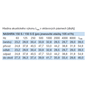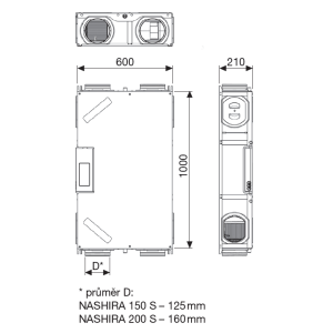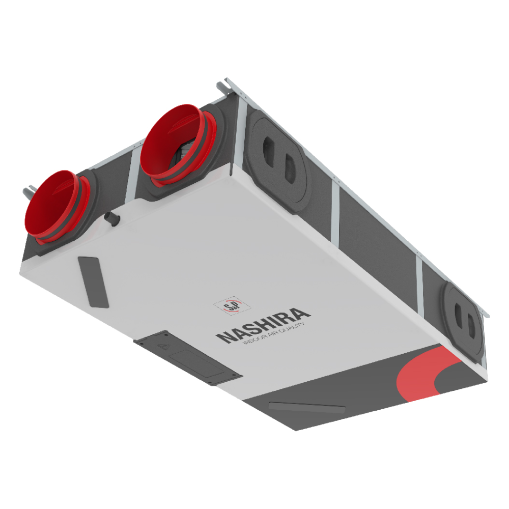 is made of durable high density EPP. The front metal panel is powder coated white. The connection circulars are Ø 125 mm (NASHIRA 150 S (E)) or Ø 160 mm (NASHIRA 200 S (E)) with the possibility of turning them to the sides of the unit. The nozzles are fitted with a double-edged seal. Revision access is from the underside of the unit.