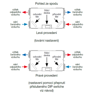 The unit is designed for horizontal installation under the ceiling indoors. By switching the DIP switch, the unit can be configured with mirrored throat positioning. The required ambient temperature is a minimum of 12 °C. The unit must be mounted to provide sufficient space for removing the unit face, replacing filters, connecting the condensate drain to the waste with a siphon odour stop and for periodic wiring inspections. If the unit is mounted above the ceiling, an inspection opening for the operator is required.