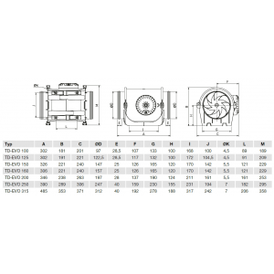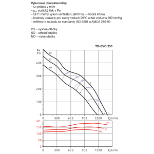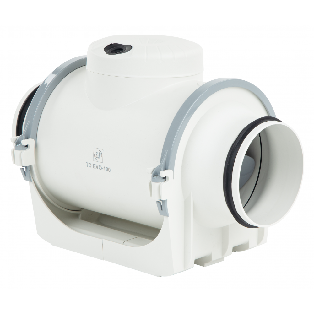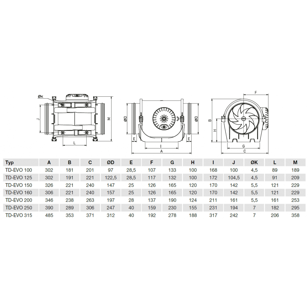 The AC motors in the TD-EVO 125 to TD-EVO 315 fans have triple windings, allowing triple speed operation. The TD-EVO VAR fans have an integrated triac controller allowing continuous power change according to the potentiometer setting in the fan terminal block or the 0-10 V analog input. The motors are equipped with thermal protection. The bearings are ball bearings with grease packing for life. Insulation class F, protection class IP44. Supply voltage 230 V, 50/60 Hz.