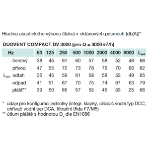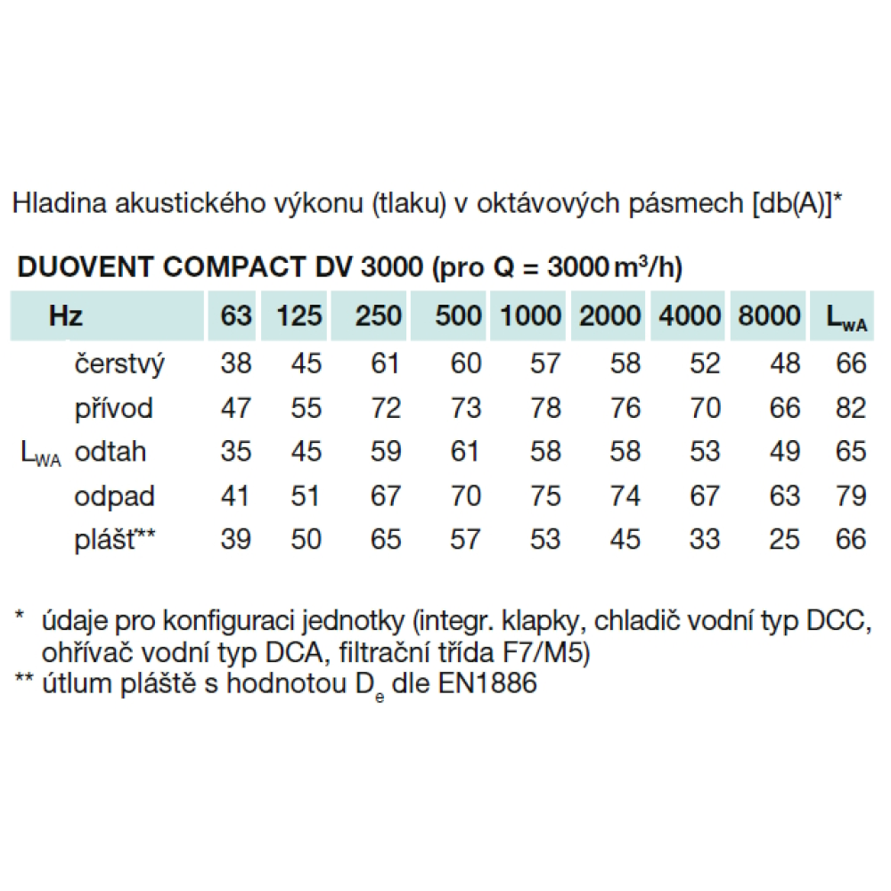 Hlukové údaje uvedené v tabulkách představují hladiny akustického výkonu na jednotlivých hrdlech jednotky s korekcí váhového filtru A, hladinu akustického výkonu pláště celé jednotky. Akustické parametry jsou v toleranci ±3 dB.