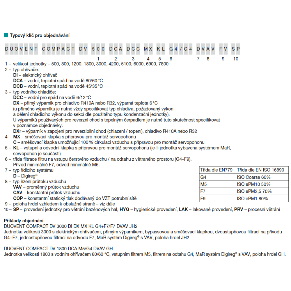 Na sání čerstvého vzduchu a sání odtahového vzduchu je možné umístit 2 kompaktní filtrační články různých tříd filtrace tloušťky 48 mm nebo 1 filtrační článek tloušťky 96 mm (pro jednotky velikostí DV 1800 až 7800). Pro velikosti DV 500, 800, 1200 je možné montovat pouze jeden filtrační článek tloušťky 48 mm. Dostupné jsou filtry v třídách filtrace od G4 do F9. Přístup k filtrům je přes revizní dveře na obslužné straně jednotky. Jednotku je možné doplnit v případě vícestupňové filtrace filtračními kazetami MFL (resp. IFL) s filtračními vložkami MFR (resp. IFR), které jsou určeny pro montáž do potrubí.
