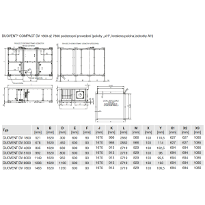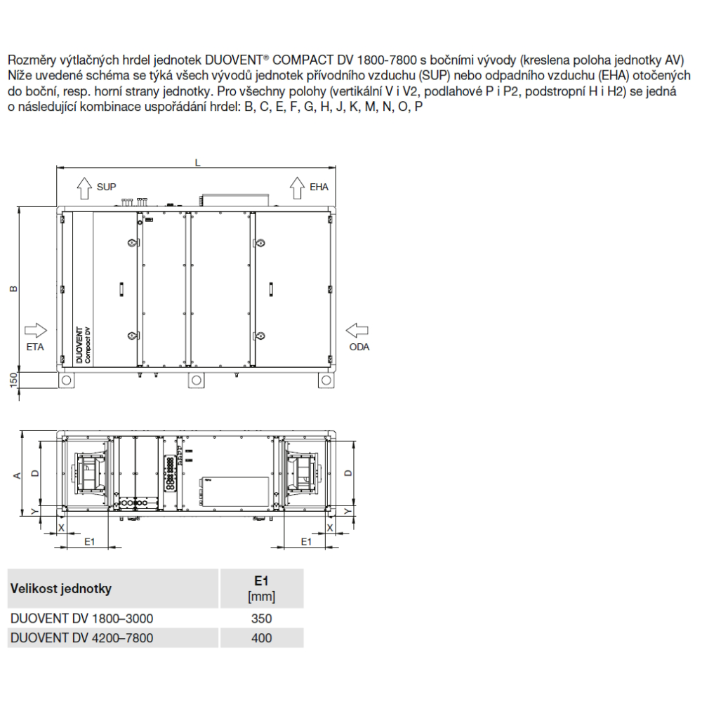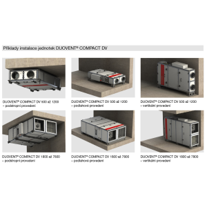 Ve vertikální (označení poloh „xV“) nebo horizontální (označení poloh „xH“) poloze pod strop nebo na podlahu (označení poloh „xP“). Konkrétní rozmístění hrdel vzhledem k obslužné straně je nutné specifikovat. Před jednotkou je nutné zachovat předepsaný servisní prostor pro potřeby servisních zásahů, výměny filtrů apod. Pod jednotkou musí být prostor pro instalaci sifonu pro odvod kondenzátu. Jednotku je nutné montovat se spádem 5% směrem k odvodnímu hrdlu kondenzátu na straně chladiče vzduchu. Potrubí VZT se připojuje na připravená kruhová (DUOVENT® DV 500 až 1200) nebo v sendvičovém panelu integrovaná obdélníková hrdla (DUOVENT® DV 1800 až 7800). Doporučujeme mezi hrdla potrubí a jednotku montovat pružné manžety pro eliminaci přenosu vibrací z jednotky do potrubí. Obdélníková hrdla jsou integrována ve stěnovém sendvičovém panelu jednotky a rozteč rohových připojovacích otvorů je optimalizována pro připojovací příruby P20. Pro podstropní montáž na závitové tyče M10 je jednotka vybavena 4 ks podstropních závěsů (pro velikosti DUOVENT® DV 500 až 1200) nebo 8 ks podstropních závěsů (pro velikosti DUOVENT® DV 1800 až 7800).