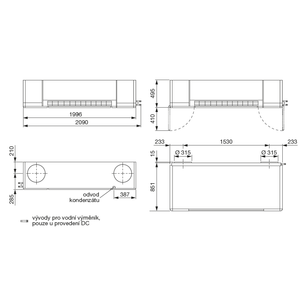 v horizontální poloze pod strop. Jednotku je možné instalovat k obvodové stěně samostatně nebo do podhledu. Pro jednotku je třeba zajistit manipulační prostor pro pravidelné revize a výměny filtrů. V případě umístění jednotky do podhledu je potřeba zajistit přístup k čelnímu panelu pro čištění rekuperátoru. Odvod kondenzátu je zajištěn integrovaným čerpadlem bez nutnosti instalace sifonu. Potrubí VZT pro přívod a odvod vzduchu přes plášť budovy se připojuje na připravená kruhová hrdla. Montáž do stropu se provádí přes 4 ks stropních závěsů, které doporučujeme opatřit příslušenstvím KIT AM HRU (antivibrační sada).